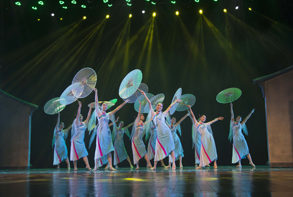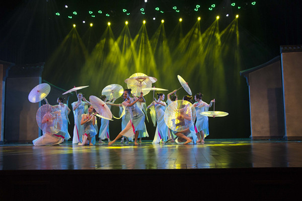 决赛现场,高手如云。聚光灯下,柔乐轻起,舞者翩翩起舞。于小城雨巷之间,用花伞描绘出江南水乡之美卷;用柔美而丰富的肢体语言,且看雨中朦胧的小女子婀娜之姿。有缓缓踱步、有轻盈一跃,或藏匿身形,或集群而舞。姑娘们仍面带笑容,每一个动作,只为完美二字,每一个步伐,只求最好。整个过程中,道具墙快速且平稳地移动着,完美地将舞蹈情节衔接起来。而道具墙的完美衔接要归功于公司男生的积极配合,他们也参与到舞蹈团的排练,确保整个节目的流畅与准确。