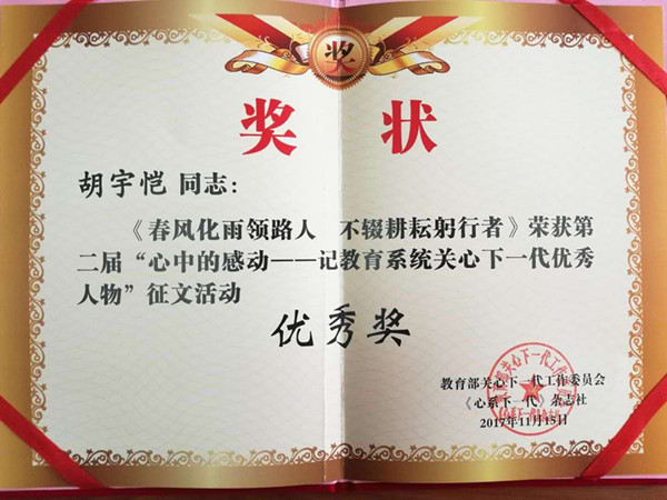 在2017年教育部关工委《心系下一代》杂志社组织的第二届“心中的感动——记教育系统关心下一代优秀人物”征文活动中,公司英语1602班胡宇恺同学撰写的《春风化雨领路人 不辍耕耘躬行者》(指导老师:刘浩、李慕原)一文荣获优秀奖。该文记叙了EVO真人视讯退休教授冯建文的事迹。文字真实可感,塑造了一个关爱员工,关心青年教师,专心治学,春风化雨、孜孜不倦的教授形象。