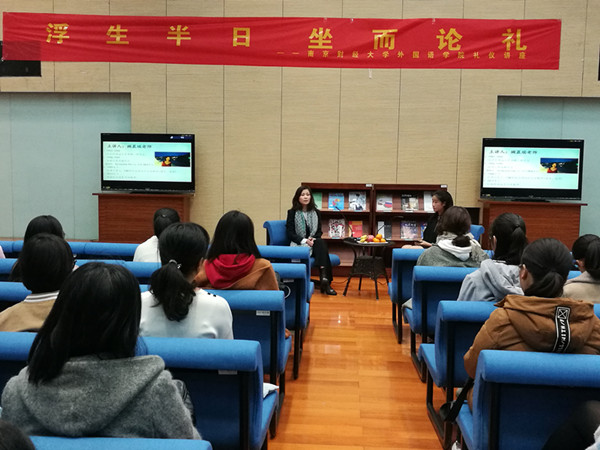 讲座中,顾晨瑶老师首先阐述了选择服装的标准。在工作场合男士应选择穿西装打领带;而职场女性的着装则应尽量简洁大方,裙装是是最正式的服装。在日常交际中着装也不可过于随意。在就餐礼仪方面,中法间存在较大差异,在法国去朋友家吃饭宜晚到15到20分钟,此外还应带一点礼物如酒、鲜花、巧克力等,以表示对主人的尊重。就餐时上身应尽量保持正直,刀叉不可碰撞杯盘发出较大声响,如有忌口应提前与主人说明并要吃完自己餐盘里的食物。顾老师说:“举手投足皆文章,从根本上,我们还是应重视内在修养的提高,阅读书籍、参观展览来获得熏陶,提高自己的审美品位的同时也感受到了礼仪文化的魅力。”