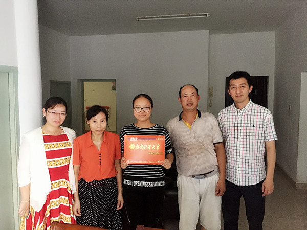 校招生办主任衣琳首先为两位送上了录取通知书,对她们成为南财大的一员表示衷心的祝贺,他从新生报到的时间、流程和注意事项等方面向两位同学及其家人做了简单的介绍,并为她们讲解了公司关于老员工医保和家庭经济困难员工资助等方面的政策,并盛情邀请两位同学的家人在金秋九月来校参观。
