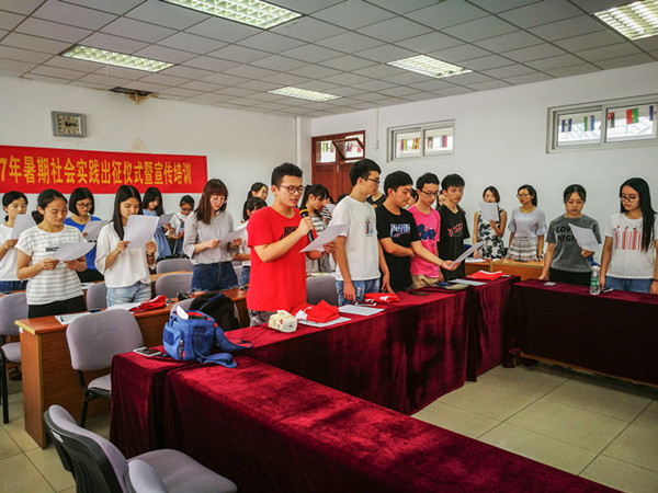 随后与会嘉宾为暑期实践团队授旗,公司2017年暑期社会实践活动正式启动。实践队员英语1602班胡宇恺同学带领实践团队宣誓,立志完成实践目标,在实践中践行知行合一理念。