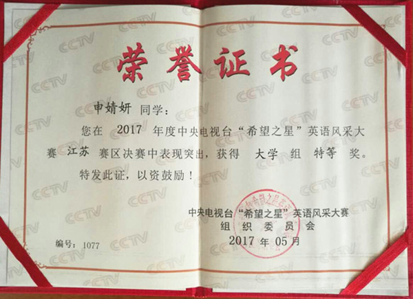 近日,中央电视台“希望之星”英语风采大赛江苏赛区决赛在镇江市句容凤凰酒店举行。公司EVO真人视讯英语1501班申婧妍同学凭借丰富的知识储备与单词量以及良好的口语表达能力荣获大学组特等奖,并成功晋级全国赛。