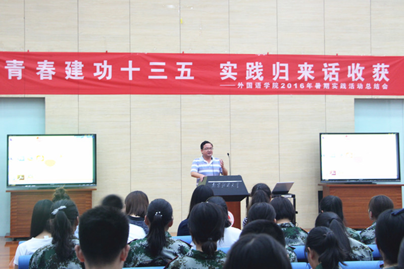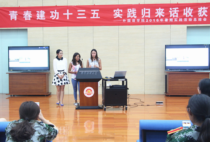 随后,公司的六支暑期实践团队代表进行实践活动成果分享,他们用丰富的图片、精彩的视频、PPT等形式,从实践内容、实践过程、实践成果、心得体会等方面将团队实践活动的点点滴滴分享给大家,赢得了阵阵掌声。“古梦清泉”实践团队代表张瑜通过讲故事的方式,向大家展示实践过程中的点点滴滴,她对贵州当地饮食以及风俗的零距离接触,以及对每位儿童的爱心、关心和责任心,感动了在场的观众;“丝路募客”团队邀请了一同参与暑期实践的哈萨克斯坦职工与大家分享他们对于“一带一路“背景下哈萨克斯坦来华留学教育的实践调研成果;研究生钱梦雨带领几名本科生组成的实践团队则深入企业对现代语言服务业建设的需求进行了调研。