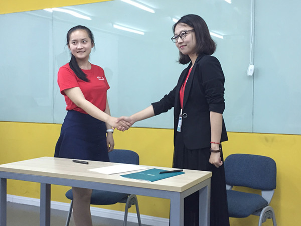 孵化营结营之前,新东方(南京)公司根据20多名营员的营地表现,结合具体情况,经过慎重考量后,遴选出了5名优秀营员现场签订实习意向书,这5名脱颖而出的优秀营员可以根据自身意愿和岗位需要成为少儿、中学或高校任何一个版块的助教老师。同时,也可以享受到新东方的晋升通道,根据自身后期表现成为正式教师、甚至进入管理层。在结营仪式上,公司和新东方南京公司共同为所有受训营员颁发了结业证书。