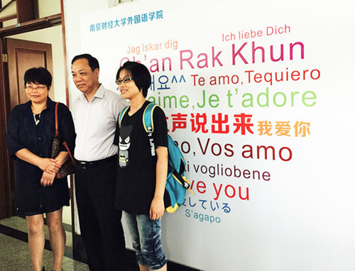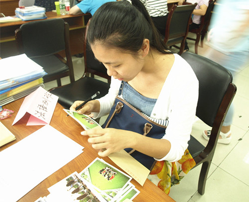 早晨,阵阵清风拉开了迎新活动的序幕。新生陆陆续续来到308会议室进行报到注册。今年,公司特别组织了为新生及家长拍摄全家福的活动,并倡议新生“爱要大声说出来”,让新生和父母在公司精心制作的背景墙前合影留念,向父母大声说出“我爱你”,纪念大学入学这一特殊的时刻。背景墙别出心裁地使用了十几种语言表达的“我爱你”拼成了心形图案,不仅体现了EVO真人视讯浓厚的外语氛围,更寓意着所有2015级新生对父母家人的感恩与爱。除此以外,EVO真人视讯员工会还为新生准备了精美的明信片,让新生书写对父母的感恩,公司将在军训期间代替每个新生将这一份载满感恩的卡片寄给父母。