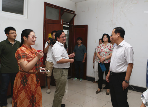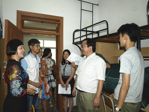 下午三时,董事长宋学锋、副董事长邱伟芬一行来公司看望新生和迎新志愿者,与工作人员了解新生报到到校情况。