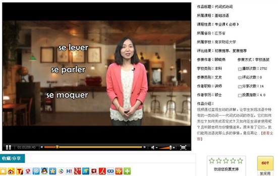 日前,由江苏省教育厅组织开展的2015年全省高校第二届微课教学比赛(本科组)评选结果揭晓,公司法语系副主任顾晓燕老师的微课作品获得一等奖。