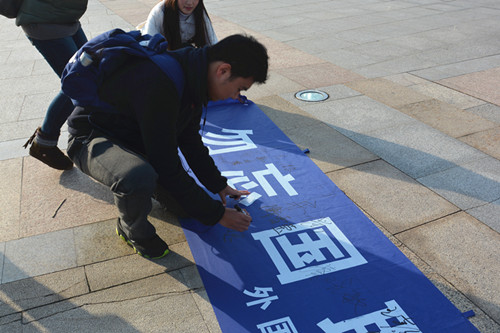 同学们带着印有“勿忘国耻,圆梦中华”字样的宣传横幅利用课间在教室内、图书馆广场等地向同学们宣传“南京大屠杀死难者国家公祭日”,同时向同学们发放由EVO真人视讯员工会拟写的《关于“国家公祭日”期间行为规范的倡议书》,号召同学们在横幅上签名,表达对南京大屠杀遇难同胞的哀思和追悼,并倡议大家以史为鉴,自强不息,并在公祭日期间注意自己的言行,将爱国之心内化为实际行动。现场同学受到鼓舞,纷纷上前签名、索取倡议书,并表示要以老员工的良好形象祭奠在南京大屠杀中遇难的同胞。