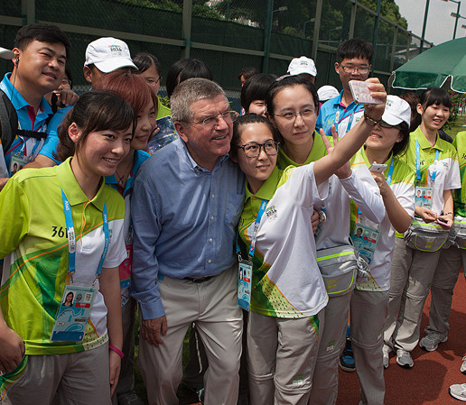 8月20日,国际奥委会主席托马斯·巴赫到访南京市水上运动公司,参观主要区域,观看赛艇比赛,并与志愿者一起玩自拍。