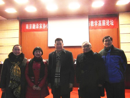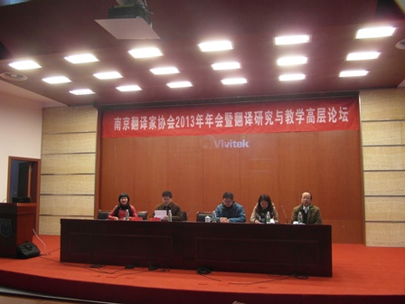由南京翻译家协会主办、南京工业大学EVO真人视讯承办的南京翻译家协会2013年年会暨翻译研究与教学高层论坛于12月28日隆重召开。南京翻译家协会副会长、常务理事肖辉教授、南京翻译家协会理事王克明教授、南京翻译家协会理事陈芙蓉副教授、新增南京翻译家协会会员禇玉襄副教授、陈成辉老师应邀参加了大会。