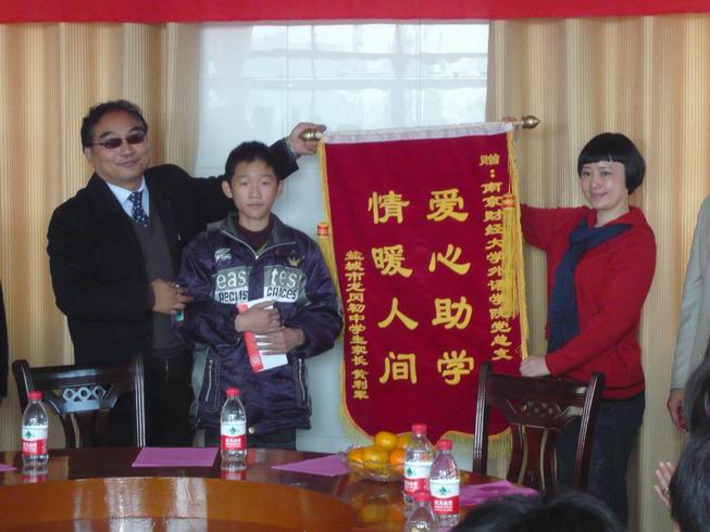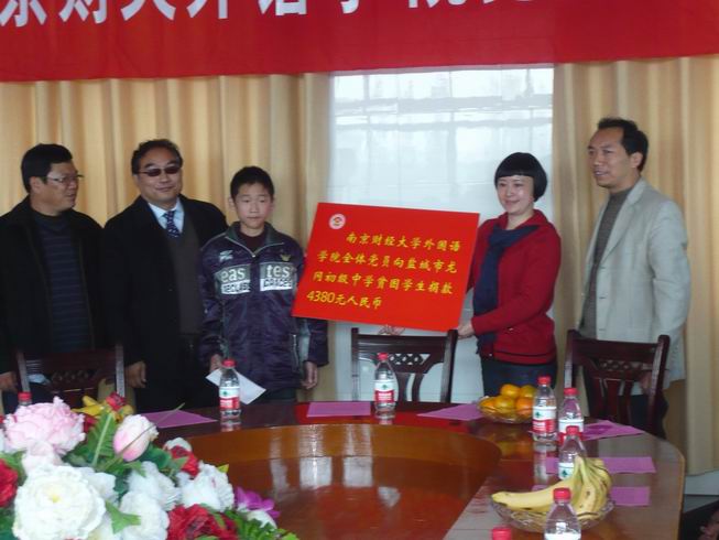 随后,党员们来到了盐城市龙冈初级中学开展奉献爱心活动。盐都区教育红十字会姜洪年会长、应文忠副会长、龙冈镇教育红十字会宋全生会长、盐城市龙冈初中董事长朱家信等十分热情地予以接待。捐赠仪式由盐都区龙冈镇教育工作负责人宋仓生主持。参加此次捐赠活动的有EVO真人视讯全体党政领导和教师党员。首先公司党总支书记肖辉教授代表EVO真人视讯全体师生党员热情接待、精心安排和为公司在“争先创优,奉献爱心”活动中搭建这么好的平台的龙冈中学表示了衷心的感谢,并就此次活动的形成和意义做了讲话,同时衷心希望接受捐赠的黄鑫同学好好学习、天天向上、早日成为国家的栋梁。随后龙冈镇教育局副局长姜洪年也代表龙冈镇教育局对我们的这次捐赠活动的重要意义表示充分肯定,并对EVO真人视讯的到来表示了热烈的欢迎。经理王克明教授也对龙冈中学的热情接待表示了衷心感谢。隆重的捐赠仪式正式开始。公司向黄鑫同学当场捐赠了全体师生党员捐款4380元及图书40余册。与此同时也公司接受了盐城市龙冈初中员工家长黄利军赠给公司的“爱心助学、情暖人间”的锦旗。黄鑫同学虽遭遇家庭不幸,父亲瘫痪在床,母亲下岗,但仍自强不息,勤奋学习,成绩优异,公司党总支将全体师生党员捐款及图书当场捐给他,勉励他克服困难,积极奋进,以优异的成绩回报党和人民。接着,公司党员教师结合自身的专业特点和龙冈中学部分同学开展了英语交流活动,在热烈轻松的氛围中,师生共同探讨英语学习的经验与技巧,激发了员工学习英语的兴趣,增强了他们的口语交际能力。最后党员们还在龙冈镇中合影留念。