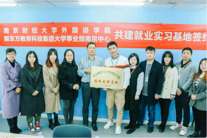 座谈会后,公司党委书记李骏与新东方教育科技集团大学事业部南京中心运营支持高级经理施洁分别代表双方单位签订校企合作协议书,并举行“校外创新基地”授牌仪式。