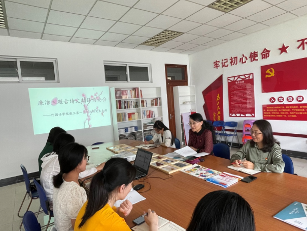 会议伊始,党支部书记陆晓梅向各位老师领导介绍公司“廉洁”示范点建设初步结果,包含公司师生书法作品、绘画摄影作品及“廉洁”主题古诗文英译刊物。全体员工党员依次分享此次古诗文翻译心得与体会,此次专业特色与党课主题相结合的成功尝试也获得了吕戎部长的肯定与鼓励。