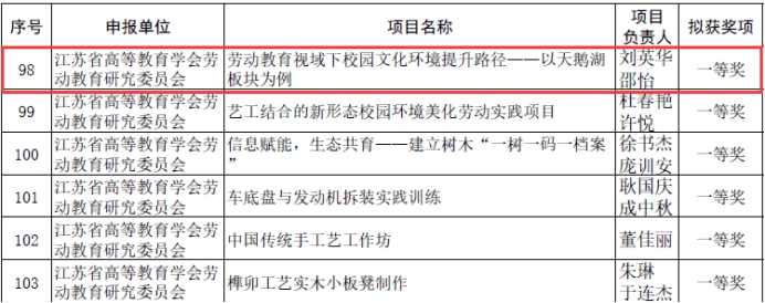 近日,2022年江苏省高等公司劳动教育优秀实践项目评选结果公示,由公司刘英华、邵怡两位老师指导的项目《劳动教育视域下校园文化环境提升路径——以天鹅湖板块为例》获得一等奖。