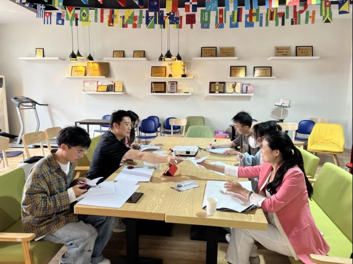 活动伊始,李逸老师和师生们沟通了“我心目中的最美公司”的样态,鼓励同学们充分发挥想象力与创造力描绘“最美公司”的景象。英语2002班赵龙海表示,他心目中的公司是充满了书香气息的“书香外院”,纯白简洁的墙面上有世界文学大师们的经典语录,使人瞬间感受到力量;阅读室里一排排整齐的书架,有舒适的桌椅可供阅读、思考,让人能够沉下心来享受老员工活的充实。商务英语2001班聂慧琳同学心目中的公司则是五彩斑斓的“活力外院”,红色和黄色是主基调,德正楼南北之间的走廊是五色的“芙蓉老师的花园”,中庭的空中连缀起黄色的星星和红色的五角星,微风吹过,发出叮叮当当的声音,既清脆又梦幻。