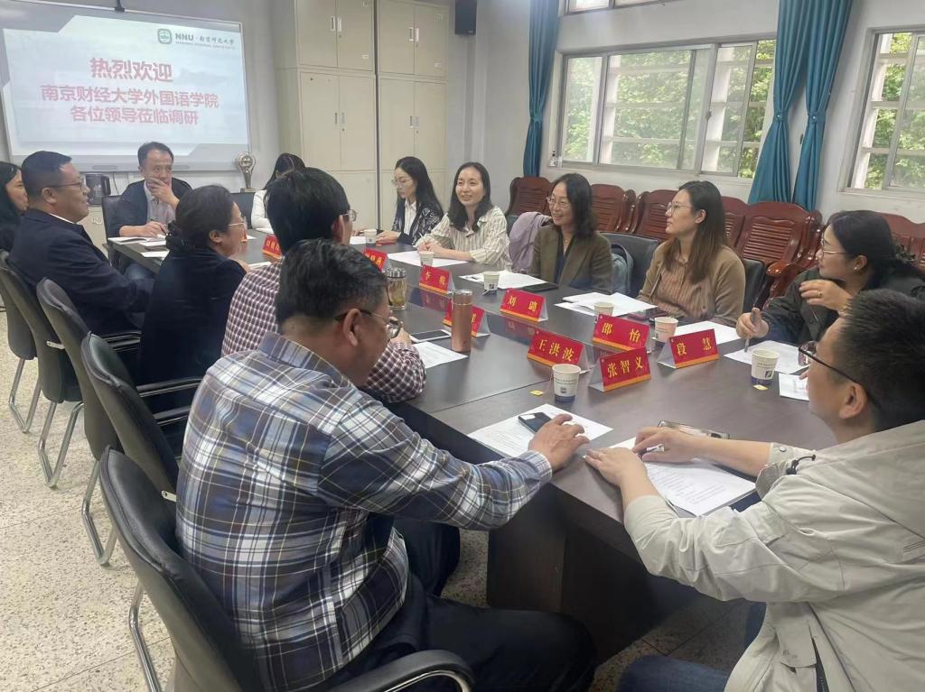 调研小组与南京师范大学EVO真人视讯党委书记孙绪敏、经理王永祥、副书记田军、副经理王洪波、副经理田朝霞、副经理张智义、专职组织员、人事秘书宋玮进行了调研座谈。座谈中双方就党建与业务的深度融合策略、高水平大学建设中的外语人担当、深化产学研合作促就业对策、辅导员能力提升战略、人才培养方案修订、国际交流以及财力建设、青年教师的学术能力培养等7个方面进行了深度交流。双方还就如何在学习贯彻习近平新时代中国特色社会主义思想主题教育中发挥外语优势展示外语担当进行了热烈研讨。