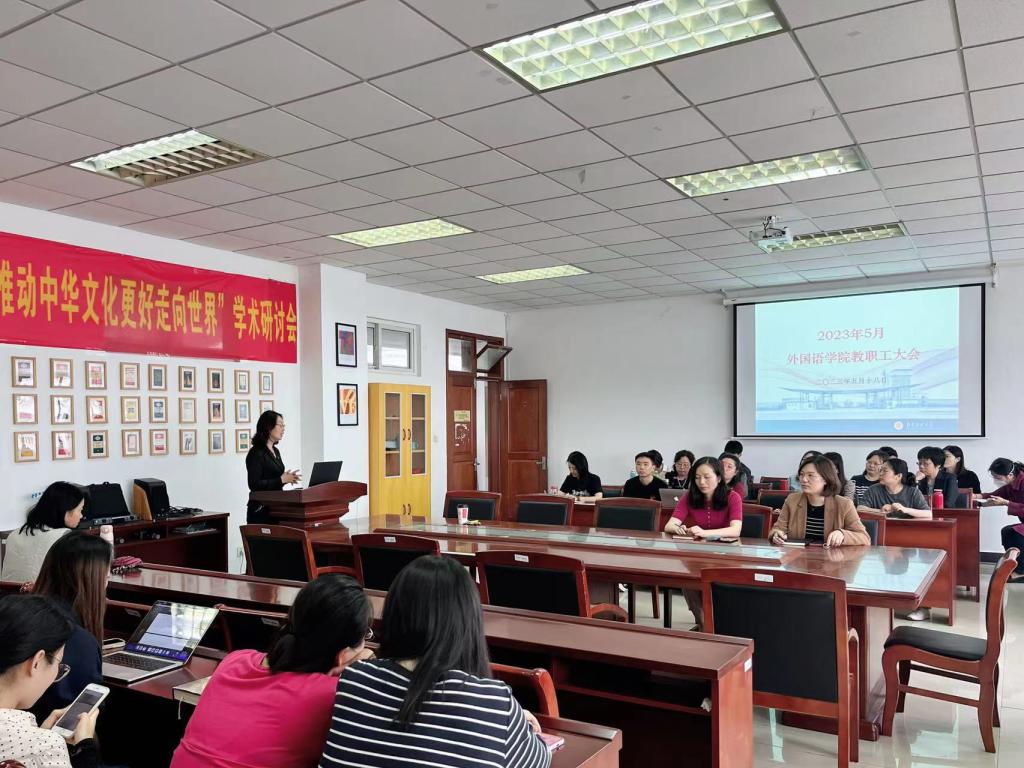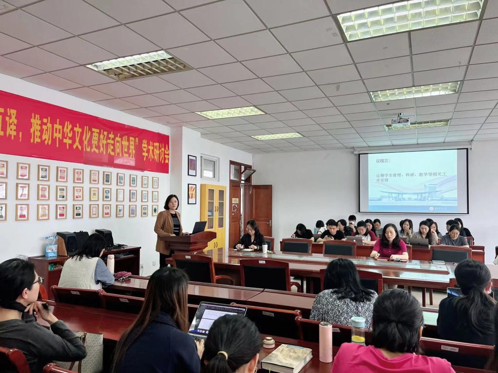 英语系主任张晓甜向全院教师传达了本科生论文答辩、就业等教学工作情况,希望论文指导及时关注员工论文进展情况,明确论文答辩重要性,及时上传相关材料,呼吁全体教师与毕业生多交流,提供就业渠道、分享就业信息,促进毕业生就业工作。