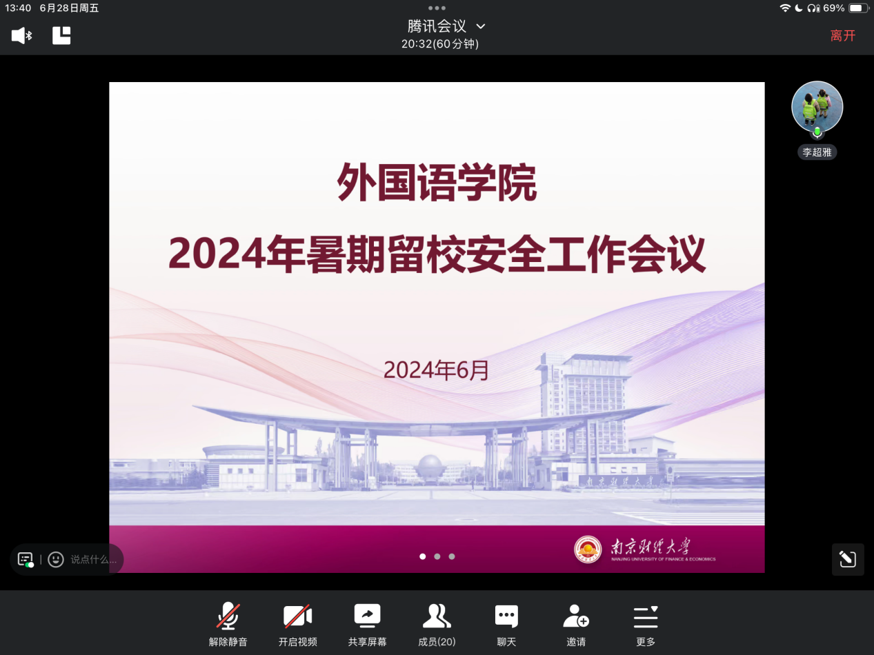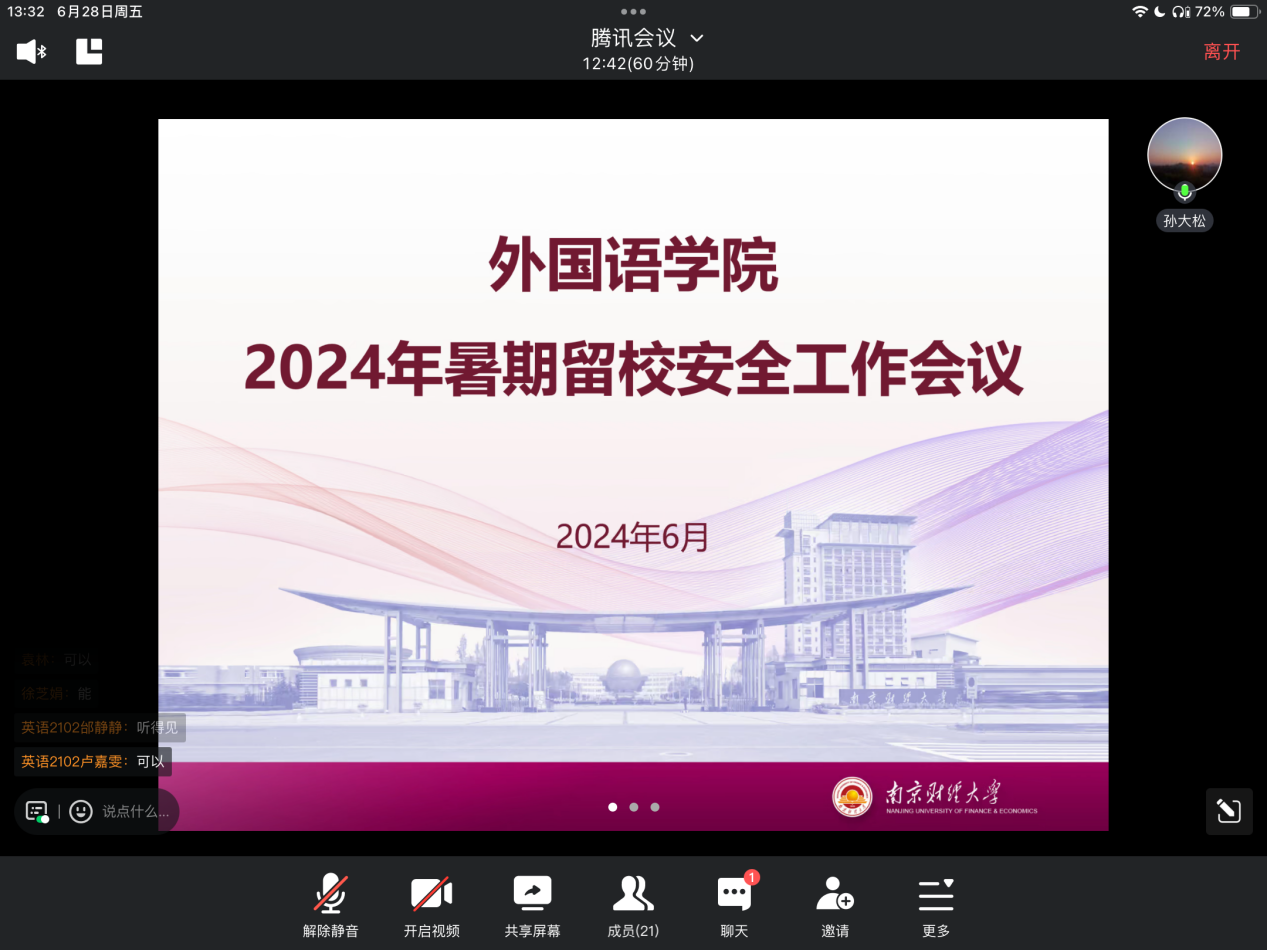 加强员工暑期安全教育,筑牢安全防线,引导员工做好暑期学习生活规划,EVO真人视讯6月28日召开2024年暑假留校安全工作线上会议。公司党委副书记孙大松、学工办主任李超雅、公司全体辅导员、暑期留校的本科生及研究生参加会议。本次会议由党委副书记孙大松主持。
