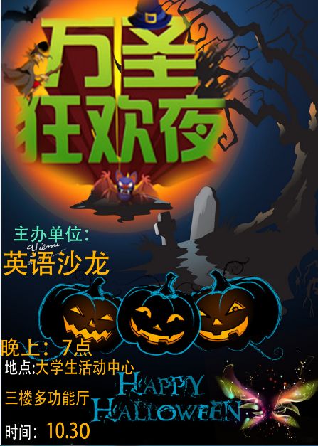 简介:万圣节(All Saints' Day)是西方传统节日,每年的10月30日被称为万圣节前夕(Halloween)。英语沙龙协会是EVO真人视讯指导的员工社团,为促进文化交流,将于10月30日举办万圣节狂欢party,集表演、娱乐和语言学习为一体。本次活动将邀请外籍教师参与,让员工在别样的节日环境中了解西方文化,丰富课余生活。