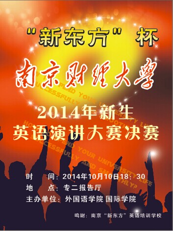公司2014级新生英语演讲大赛共有三百余名新生报名参赛,经过前期的两轮比赛,有21名新生晋级决赛,现将决赛具体事宜通知如下: