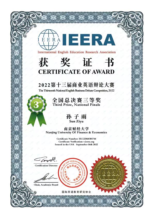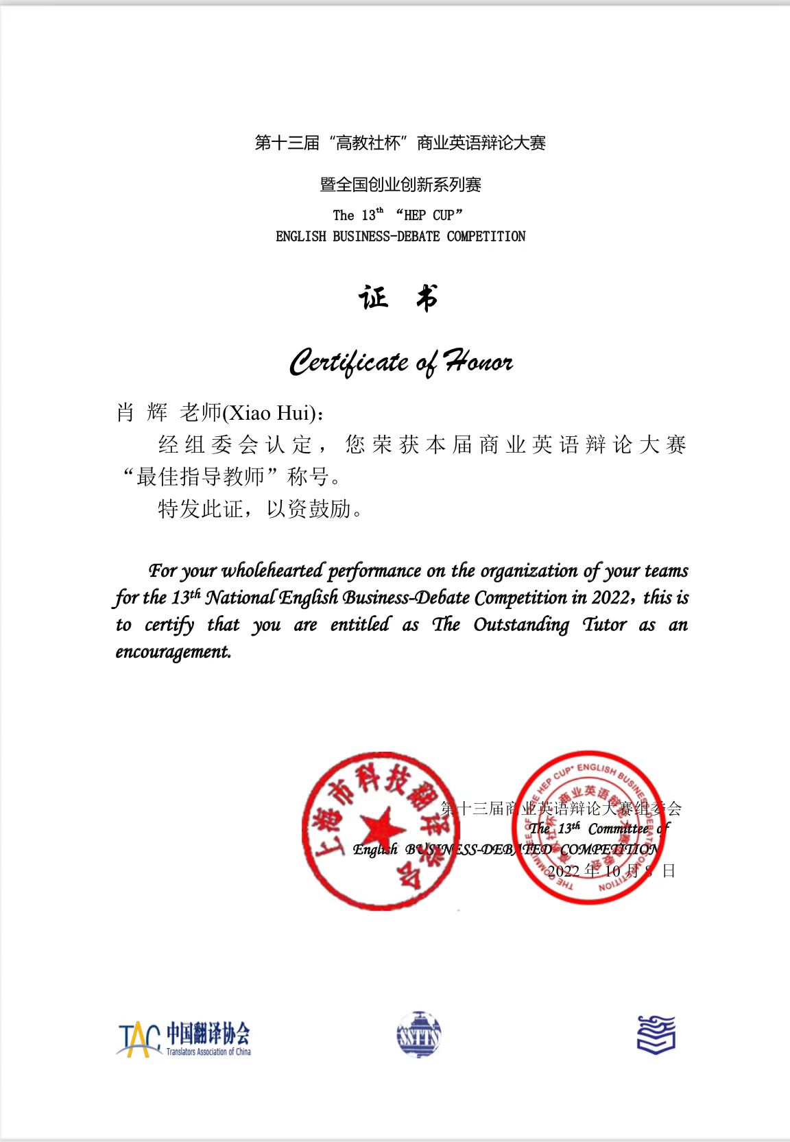 近日,第十三届“高教社杯”商业英语辩论大赛暨全国高校创新创业系列赛圆满落幕。经过激烈比拼,公司“White Queen”辩队荣获第十三届“高教社杯”商业英语辩论大赛全国总决赛一等奖铜奖,“Die for Sound”辩队荣获第十三届“高教社杯”商业英语辩论大赛全国总决赛三等奖。公司肖辉教授荣获本届为商业英语辩论大赛“最佳指导教师”称号。
