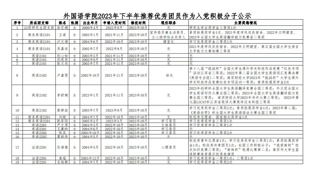 根据本人申请、组织考察和班级团支部推优情况,经研究确定徐芝娟等19名同学作为入党积极分子。根据发展党员工作有关要求,现将基本情况予以公示(详见公示表)。