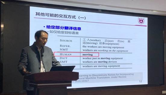 南京大学自然语言处理研究组、计算机软件新技术国家重点实验室黄书剑副教授在会议中做精彩讲话,发言谈及“机器翻译中的交互方法和信息利用”。黄教授指出,独立使用机器、从数据中学习翻译知识具有海量、实时和价格低廉的优点、但质量难以保证。而另一方面,独立使用人工、依靠人类的翻译知识,准确可靠但成本高、实时性差。因此,人工智能翻译研究方向趋向是人机交互式翻译,让机器进行大量、简单的工作,而人工进行少量、关键的工作,并介绍现有交互方式。人机交互难点在于如何兼顾用户的使用习惯、操作难度、反应速度等。