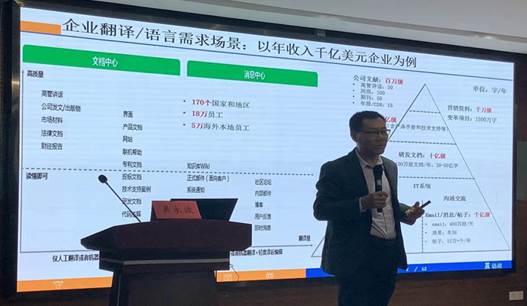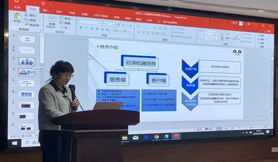 深圳云译科技有限公司CEO丁丽的讲话主题是“基于人工智能的科技翻译和语料库建设实践”,介绍了语料库建设实践、基于人工智能的科技翻译和翻译市场发展前景,并现场展示了云译翻译机以及应用。