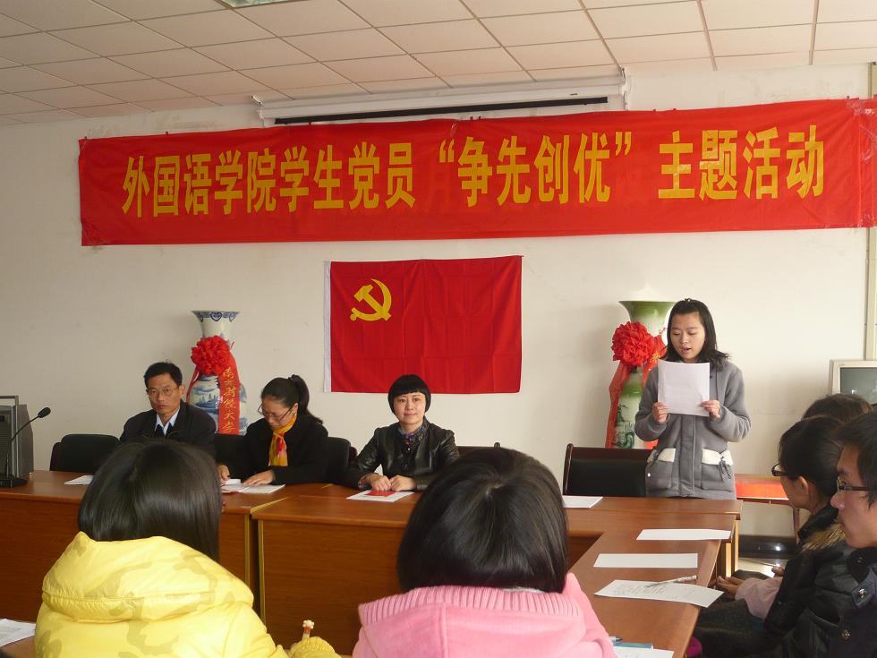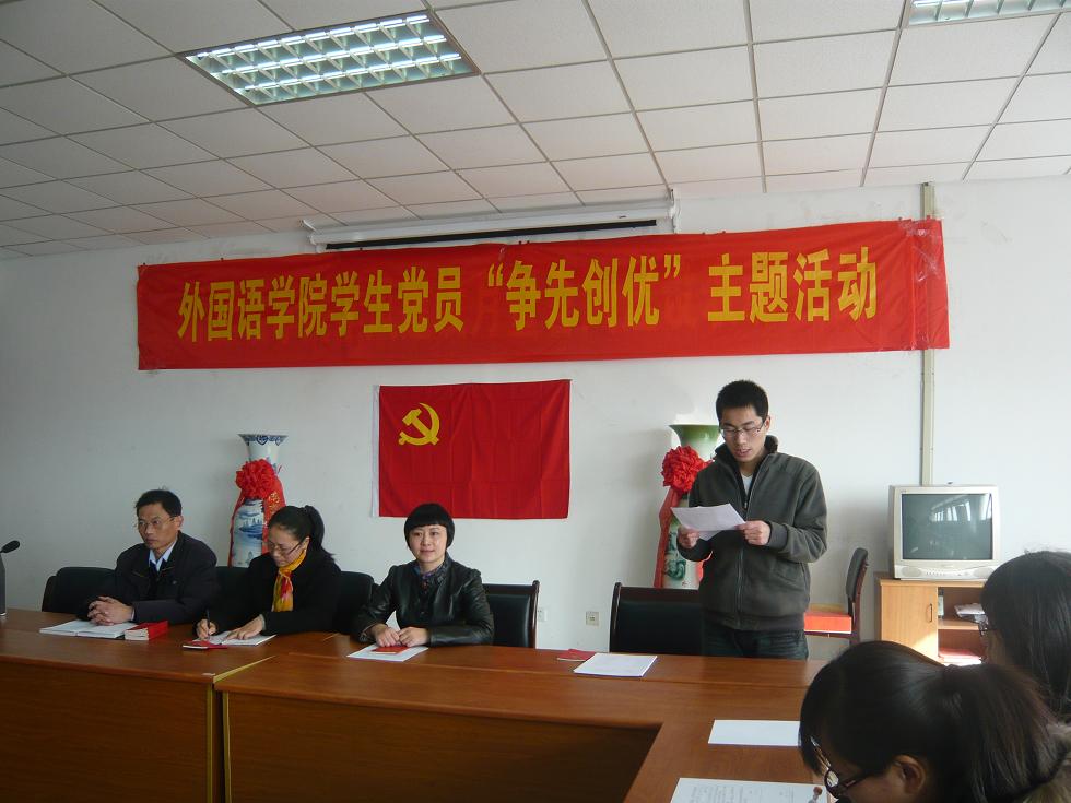 各年级的员工党员代表纷纷发言。研究生党员丁晓超同学、07级本科生李晓军同学、08级本科生李腾佳同学以及10级新生张美君同学,分别结合自身实际,代表本年级的同学,做出了“创先争优”的个人承诺。团总支书记金立林老师也对各员工代表的发言进行了简要总结。