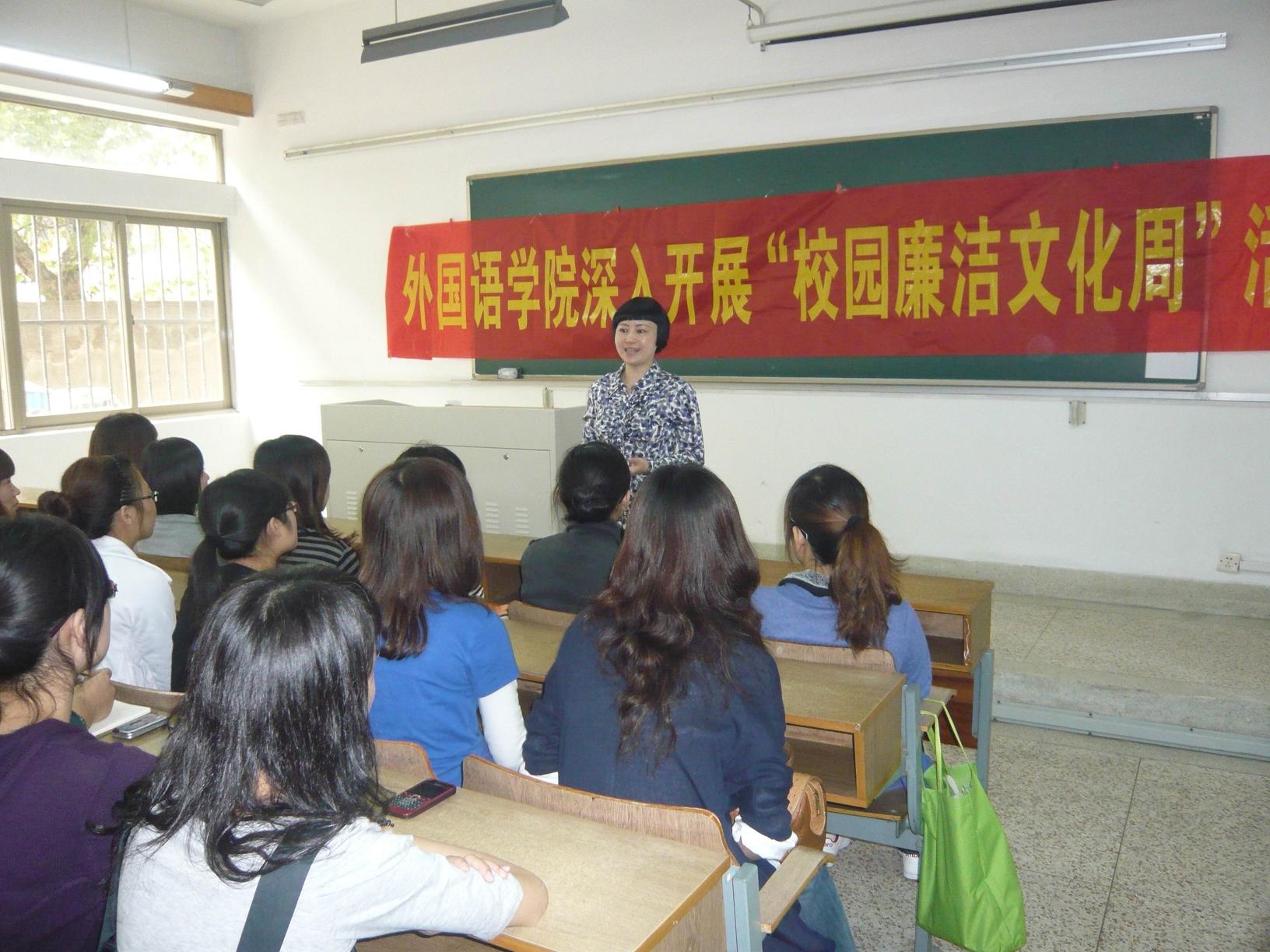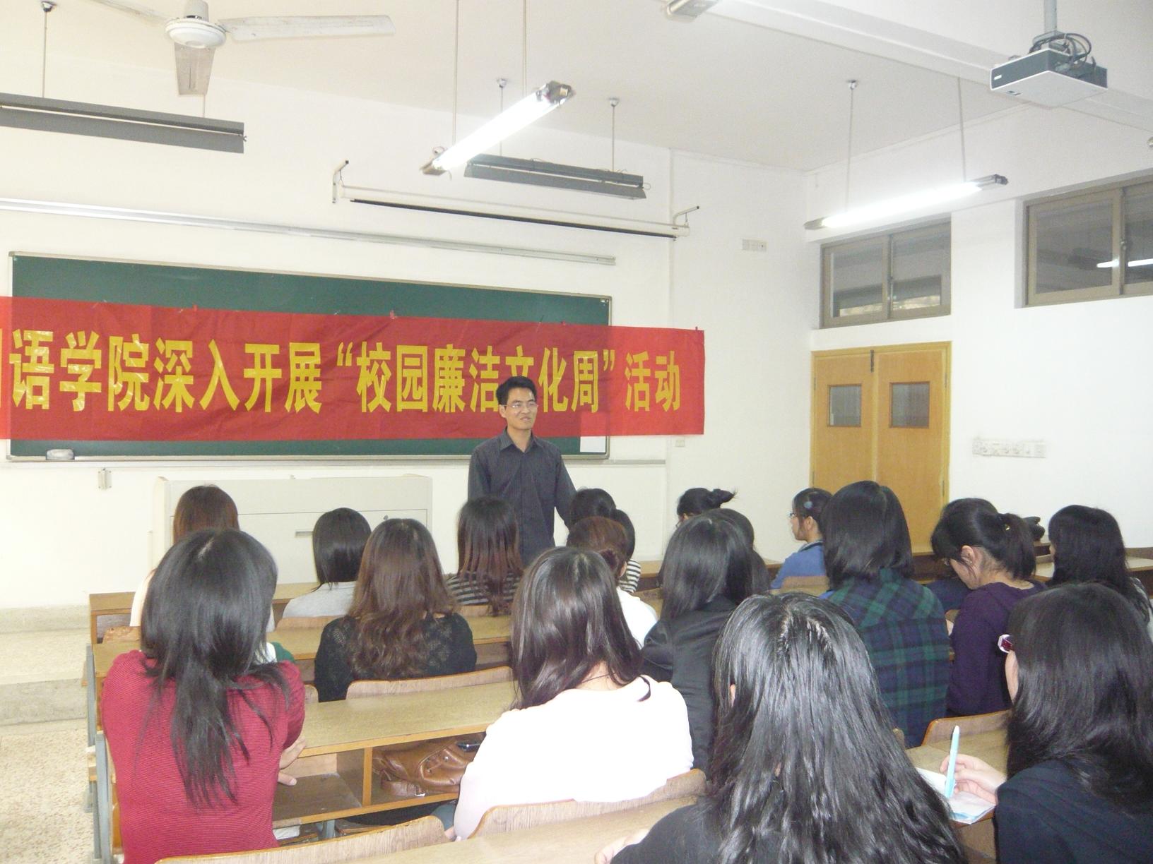2010年10月8日中午在福建路校区教二101教室,党总支书记肖辉教授为公司福建路校区全体员工党员做深入开展“校园廉洁文化周”活动的动员报告,出席报告会议的有公司福建路校区全体员工党员及辅导员王连超老师。