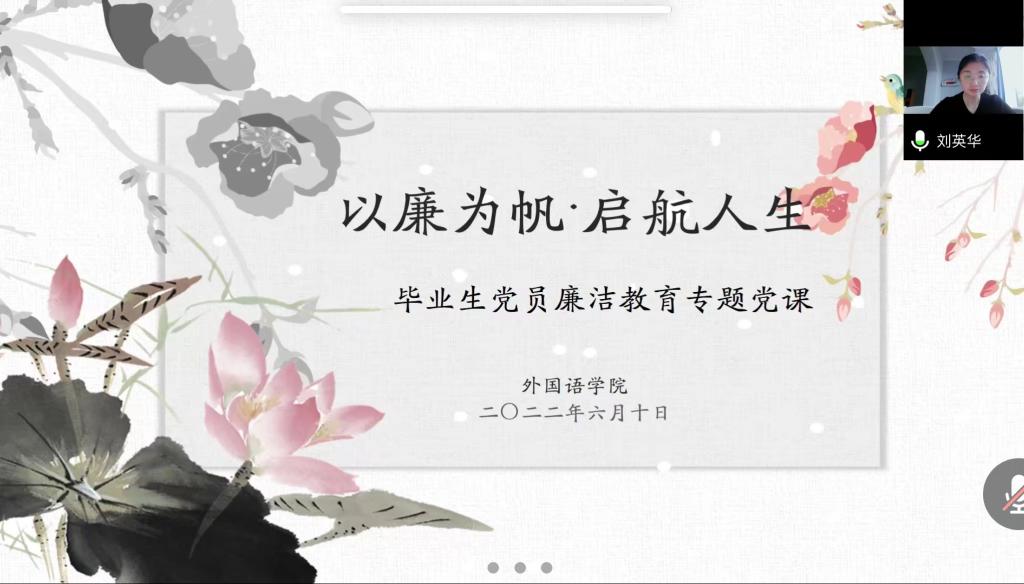 为进一步加强2022届毕业生党员廉洁教育,培养毕业生党员廉洁自律意识,6月10日,公司党委副书记兼纪检委员刘英华在线给毕业生党员讲授“以廉为帆,启航人生”廉洁教育专题党课。