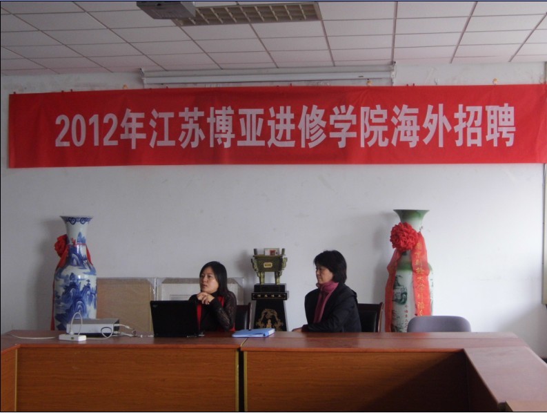 2012年11月7日下午2点,江苏博亚进修公司海外招聘会在公司专三308举行。此次招聘会是针对公司英语专业的应届毕业生,工作地点在非洲安哥拉,前期需要在国内进行为期半年的葡萄牙语培训,培训结束到海外从事的是英语及葡萄牙语的翻译工作。来自博亚进修公司的两名招聘官给大四的员工讲解工作具体内容。