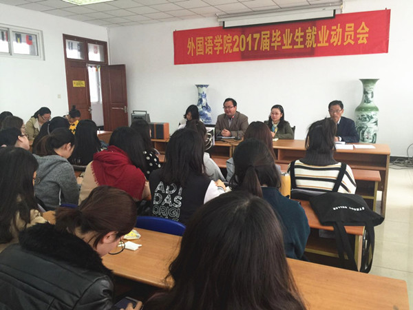 11月8日,公司2017届毕业生就业动员大会在法政学科楼308会议室举办,公司党委书记刘浩、副书记李慕原、英语系段慧老师、学工办主任薛桂芳以及毕业生辅导员孟德明老师出席了本次会议。2013级全体员工参加会议。