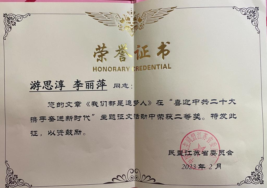 民盟江苏省委近日公布“喜迎中共二十大,携手奋进新时代” 征文获奖名单,公司民盟盟员游思淳、李丽萍提交的散文诗《我们都是追梦人》荣获二等奖。