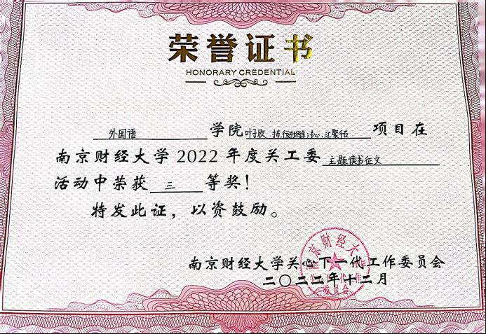 此外,在江苏省教育系统关工委举办的“2022年主题教育读书及征文活动”中,公司法语2201班叶子欣同学撰写的文章《寸步,行进坦途;寸心,汇聚千古》荣获三等奖。