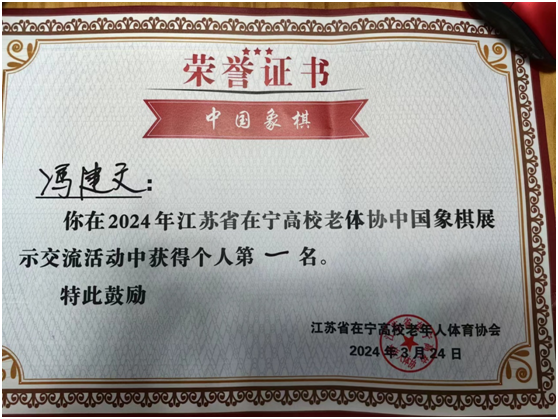 日前,在南京师范大学随园校区结束的2024年在宁高校象棋展示活动中,EVO真人视讯退休教师冯建文教授荣获2024年江苏省在宁高校老体协举办的中国象棋展示交流活动个人冠军。比赛本着“切磋棋艺,增进交流”的目的,各位棋手架炮驱卒,跃马横车,异彩纷呈。本次比赛既丰富了在宁高校退休教职工的文化生活,也为棋类爱好者搭建了交流棋艺的平台,磋了棋艺,增进了友谊,受到了教职工们的欢迎和好评。
