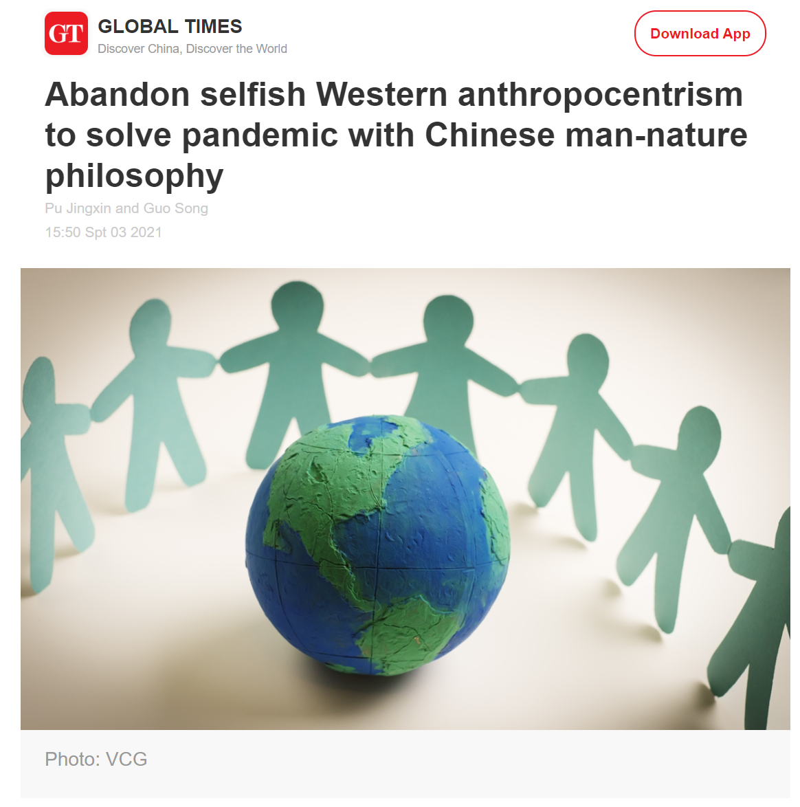 蒲婧新老师还在《Global Times》发表了《摈弃西方人类中心主义,用中国“天人合一”哲学抗击大流行病》(Abandon selfish Western anthropocentrism to solve pandemic with Chinese man-nature philosophy)以及《中国“天人合一”哲学观对抗击疫情的新启示》(‘Humanity as continuity', the new inspiration from China's philosophy to fight the pandemic),文章批判西方人类中心主义,倡导中国“以人为本”、“天人合一”的哲学智慧与治理成效,使全世界民众更清晰地认知中国文化精髓与治理智慧。