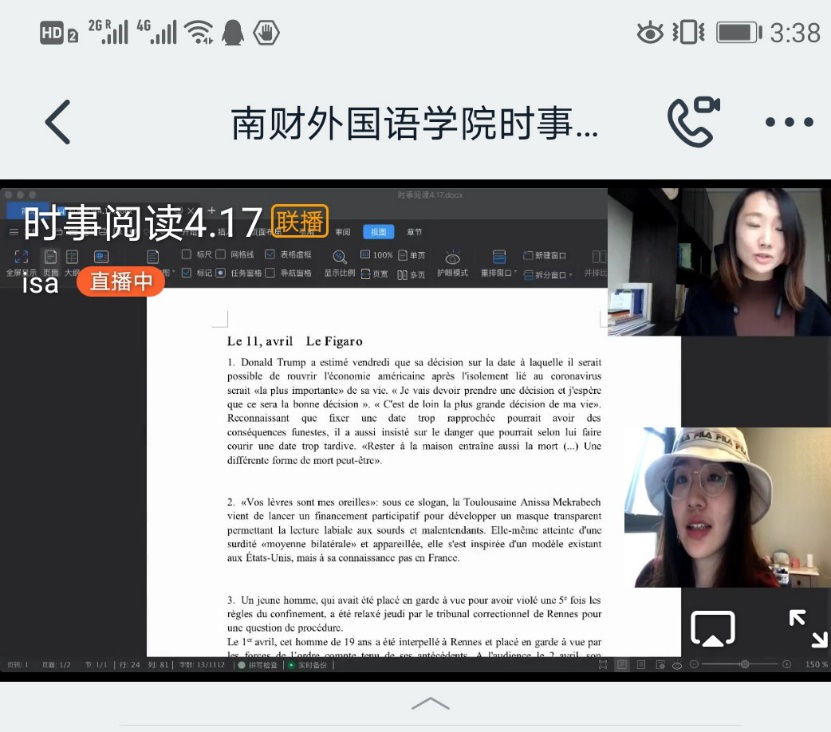 为了员工安全返校学习,老师们的在线课堂也好不松懈,早早地就做起了准备工作。凌燕老师在“法语时事阅读”中讲起了多种类型的“口罩”用法语如何表达,顺便普及了一下科学知识,同时还通过一篇国家元首演讲稿分析疫情期间解除隔离的利与弊,使老员工们对特殊时期的国家经济与社会发展有了新的认知;白天老师则给员工们阅读了4月6日英女王伊丽莎白的战疫演讲《美好的日子终将会回来的,我们将会重逢》,在和老员工们一起分享纯正英式英语的同时,也使同学们感受到了互相关爱、鼓励的美好……