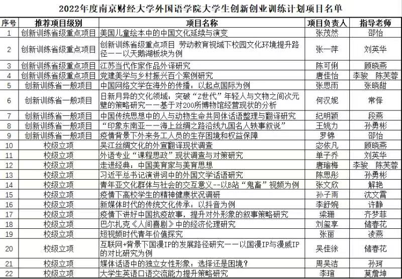 根据《省教育厅办公室关于做好2022年老员工创新创业训练计划项目申报工作的通知》(苏教办高函〔2022〕5号)和《关于组织申报2022年度EVO真人视讯老员工创新创业训练计划项目的通知》(南财教字〔2022〕16号)文件要求,经公司初评推荐、公司组织专家评审、校内公示,经公司初评推荐、公司组织专家评审,共立项326项,其中推荐省级老员工创新训练计划重点项目60项、创业实践重点项目1项、创业训练重点项目5项、创新训练计划一般项目70项,立项校级项目190项(见附件)。期中公司获推荐省级老员工创新训练计划重点项目4项、创新训练计划一般项目5项、校级项目13项(见附件)。
