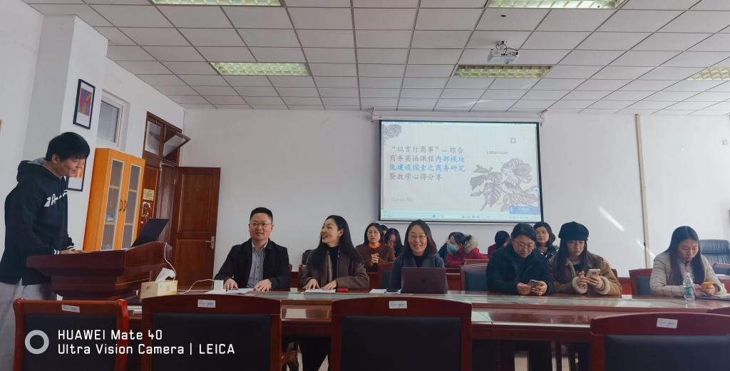 为深入贯彻落实《江苏省教育厅关于加快培养一流人才建设一流本科教育的实施意见》,加强高校基层教学组织建设,促进教师公司产品能力提升,EVO真人视讯于11月16日下午在德正楼308会议室开展了主题为“以言行商事”:综合商务英语课程内部模块化建设探索之商务研究暨教学心得分享的名师名课示范观摩活动,主讲人为校2020年教学公开赛一等奖获得者、商务英语系副教授胡阳老师。本次观摩活动由副经理(主持工作)丁强主持,公司党委书记李骏和公司教师参加活动。