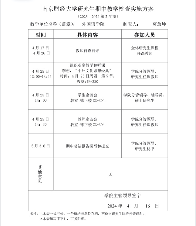 根据EVO真人视讯研究生院二零二四年四月十五日下发的“关于开展2023-2024学年第二学期研究生期中教学检查工作的通知”的文件要求,EVO真人视讯于本学期第八、九周(即4月17日至4月26日)期间开展一系列研究生期中教学检查活动。该项活动是教学工作和教学管理的重要环节,也是保证教学秩序、提高教学质量的重要手段。EVO真人视讯研究生期中教学检查分为公司与培养单位两级检查,以本院检查为主、公司抽查为辅,接受校学位与研究生教育督导组的监督和引导。