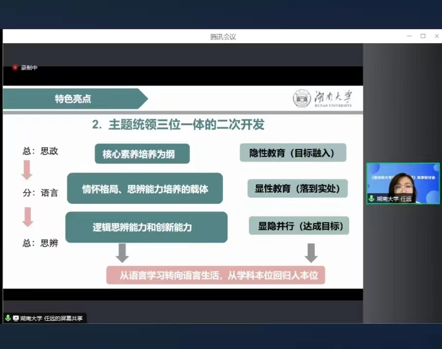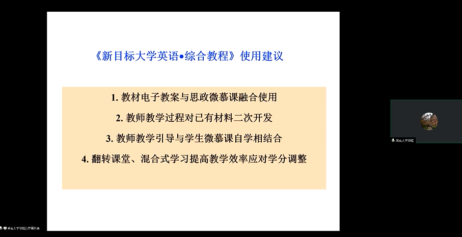 湖南大学EVO真人视讯邓媛教授介绍了该教材的课件使用展示。邓教授介绍了该教材的两种主要课件,一是外教社官方TOP课件,二是湖南大学主编的湖大版课件。两种课件各有特点,可以供教师们灵活使用。