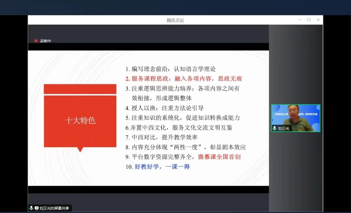 接下来,《新目标大学英语综合教程》主编团队的几位专家分别做了报告。该教程的总主编,湖南大学EVO真人视讯二级教授刘正光首先就该教材的编写理念做了讲解。刘教授指出,该教材是基于认知语言学前沿理论编写,既使语言学习系统化、一课一得、注重培养员工逻辑思辨能力,同时使员工更好地进行中西方文化对比,全方位融入课程思政内容。这是一本彰显剧本效应,旨在授人以渔的兼具实用性和思想性的教材。