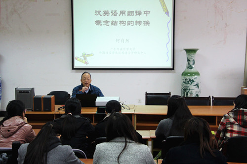 何自然教授以语用翻译论的概念为出发点引出报告主题,他首先指出目前大众对语用翻译论的错误理解,语用翻译论(pragmatics-oriented translation)应当将语用学理论和方法指导的翻译理论与实践相结合,做到“为译文读者而译”。随后,何自然教授介绍了汉英两种语言思维模式和概念结构差异,是双语和对比语言学的主要内容。他向同学们讲解了翻译过程的“三相”模式——即理解-转换-合成(解码-转码-编码)的过程,并通过具体的汉英互译例子风趣生动地阐述了汉英概念结构转换的具体应用。报告最后,何自然教授提出,母语为汉语的翻译工作者,要从事汉译英的工作,就必须注意尽可能摆脱母语的思维模式和概念结构的束缚和影响。