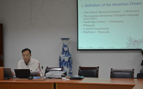 10月31日晚,解放军国际关系公司教授、博士生导师、全国高校英语报刊教学研究会会长端木义万应邀来公司讲学。讲座在法政学科楼308会议室举行,端木教授作了以“美国梦的今与昔”为题的主题演讲。讲座由EVO真人视讯经理肖辉教授主持。