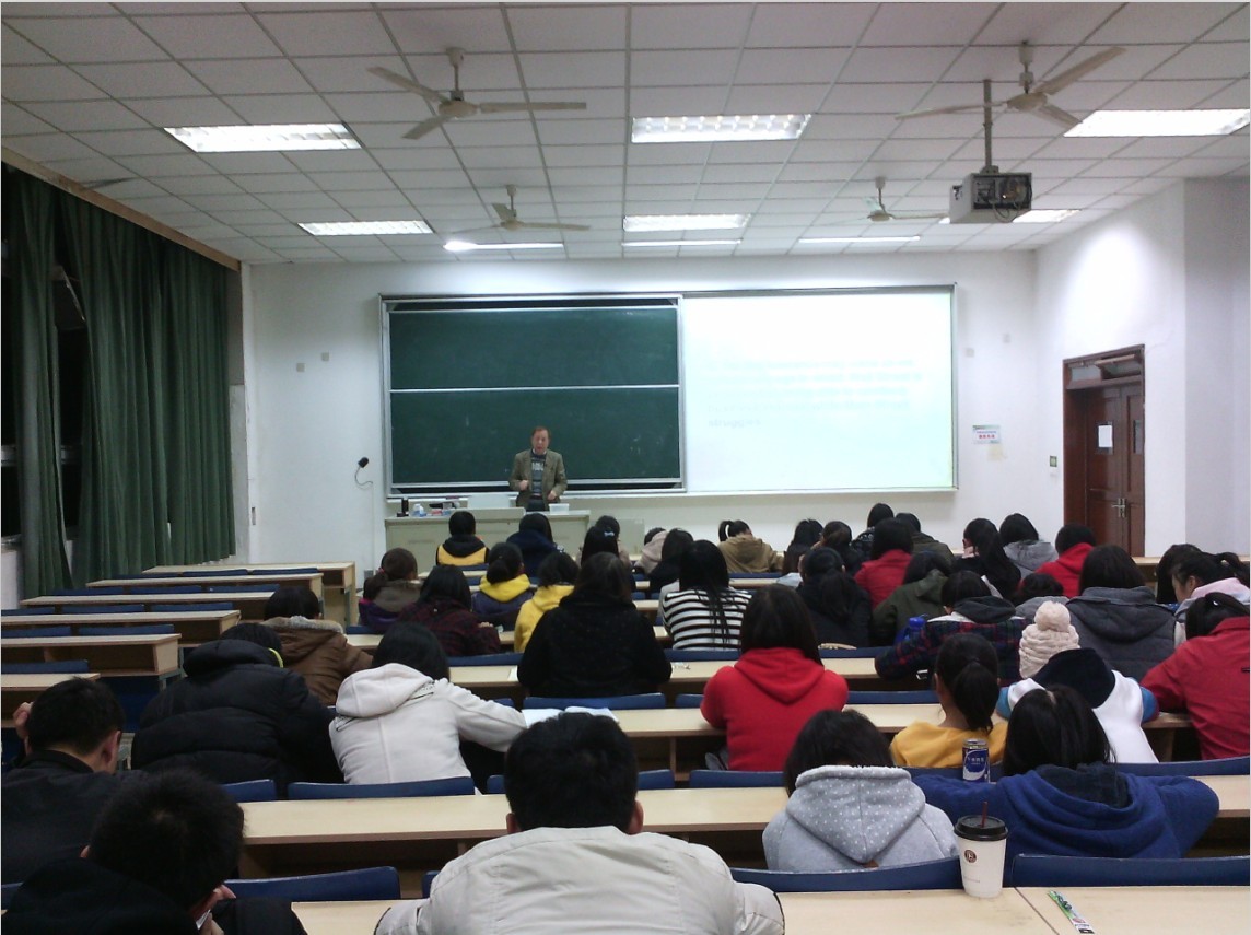 端木教授最后强调文化的重要性,鼓励我们努力学习,“make great efforts to improve your English language”。整个报告气氛十分活跃,同学们十分专心,教授还不忘与同学们交流,回答同学们的问题。晚上八点报告结束,雷鸣般的掌声响起在教室里。对于这场持续了一个半小时的讲座,同学们纷纷表示意犹未尽,受益匪浅。