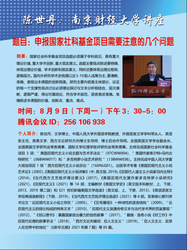 8月9日下午13:30至16:30,中国人民大学EVO真人视讯陈世丹教授应邀为公司师生作了题为“申报国家社科基金项目需要注意的几个问题”的线上讲座,讲座以腾讯会议为平台。公司众多师生共同聆听了此次讲座,讲座由经理助理顾晓燕老师主持。
