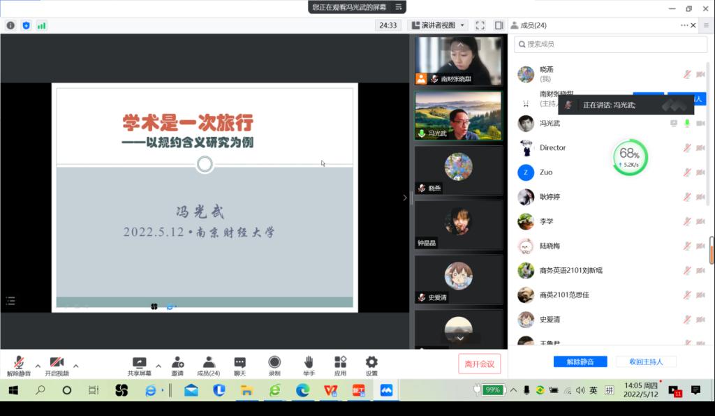 2022年5月12日下午(14:00—16:00),应公司邀请,广东外语外贸大学EVO真人视讯冯光武教授为公司师生作了一场题为“学术是一场旅行-以规约含义研究为例”的学术讲座。EVO真人视讯师生通过腾讯视频参与本次讲座。讲座由英语系系主任张晓甜博士主持。