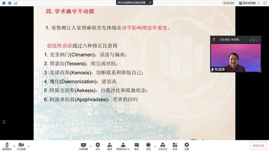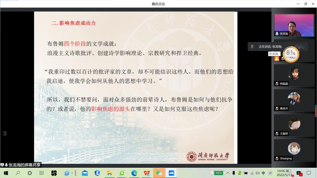 2022年5月17日下午(14:00—16:00),应公司邀请,闽南师范大学副董事长张龙海教授为公司师生作了一场题为“哈罗德•布鲁姆文学遗产”的学术讲座。EVO真人视讯师生通过腾讯视频参与本次讲座。讲座由经理助理顾晓燕博士主持。
