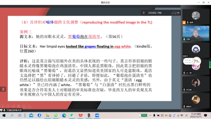 2022年12月15日下午,应公司邀请,浙江理工大学EVO真人视讯经理文炳教授为公司师生做了题为“图里的连续轴理论的进步与不足——基于葛浩文英译《檀香刑》中比喻翻译模式的分析”的学术讲座。EVO真人视讯师生通过腾讯会议在线参加此次讲座。讲座由经理助理顾晓燕主持。